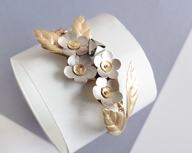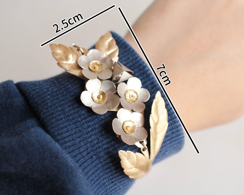 雪柳のバングルです。真鍮の金色の葉っぱと、洋白の小さな銀色の花が清楚なイメージを与えるバングルです。