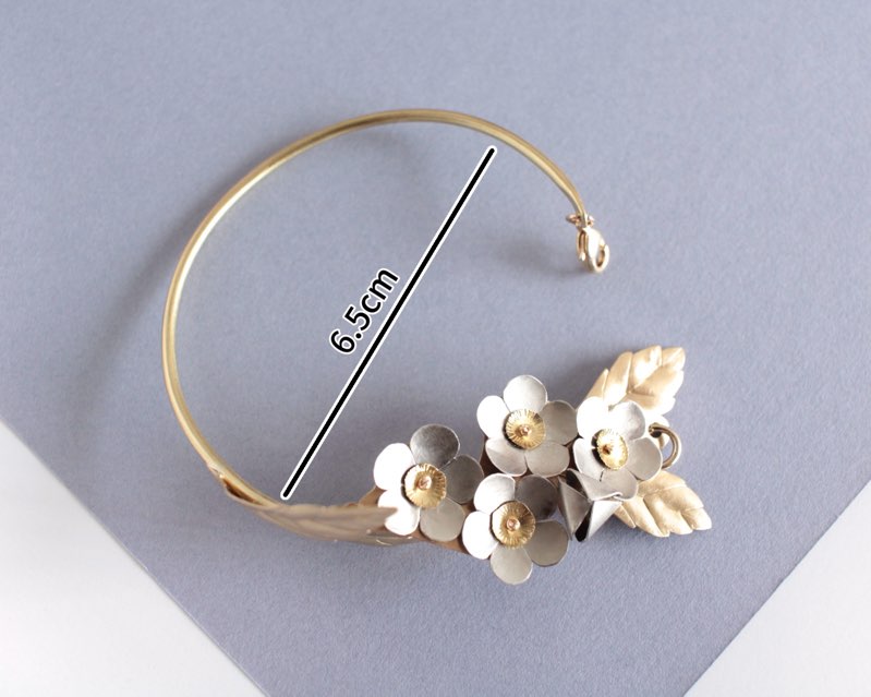 花部分が動き、腕を通したあとカニカンで留めて腕につける形のバングルになります。