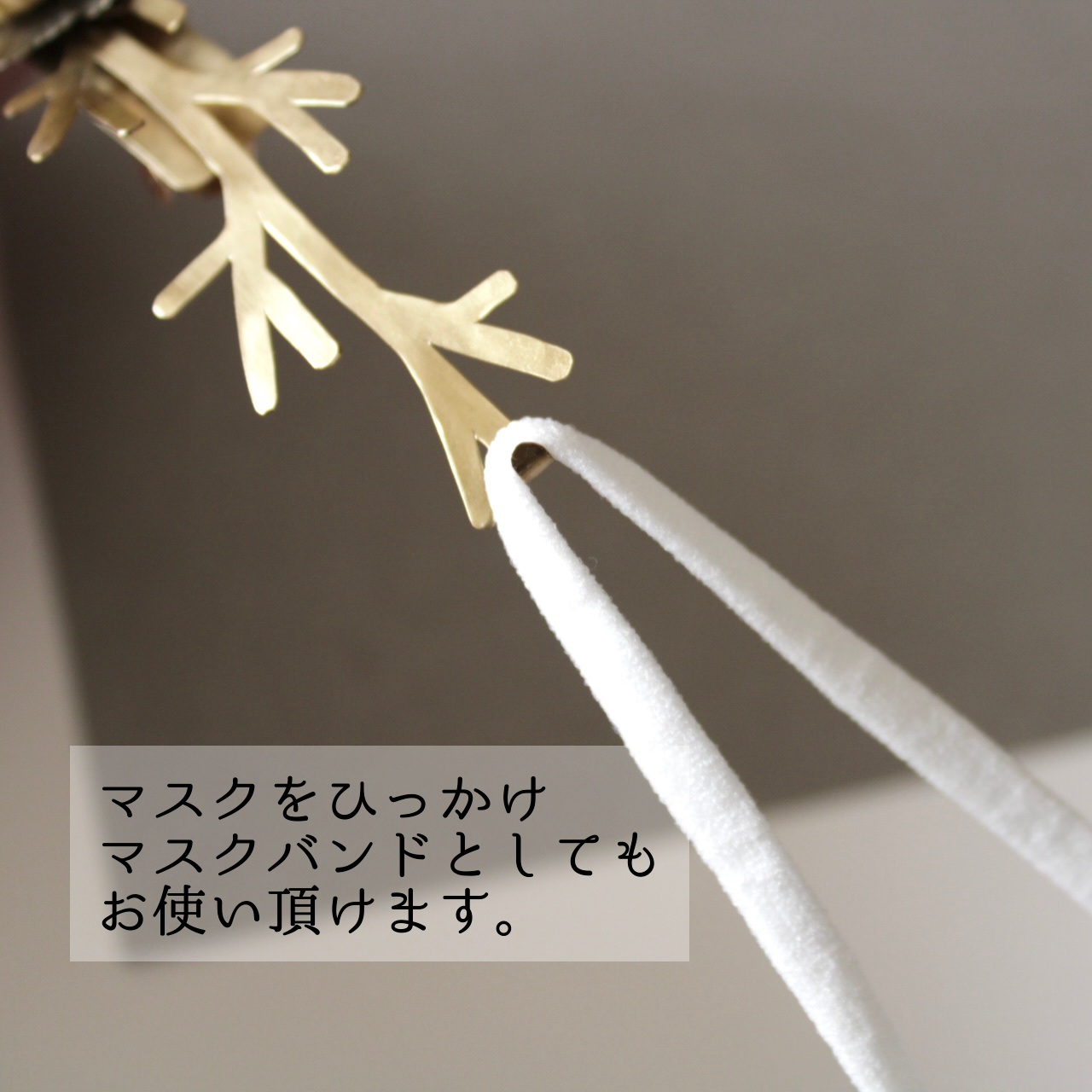 マスクは葉の部分にかけることができます。(手作りですので葉の形には少し差異ができます)バレッタを髪に留めてからマスクバンドとしてお使いいただくと、マスクがズレたりせずお使いいただけます。