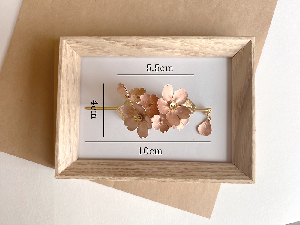 お写真では気づかなかったのですが、蕾が1つアクセントで入っていたりして手にとってわかる細かな造形に感動しました。くしの先にも花びらが一片ついていて、動くたびに揺れてとてもかわいらしいです。